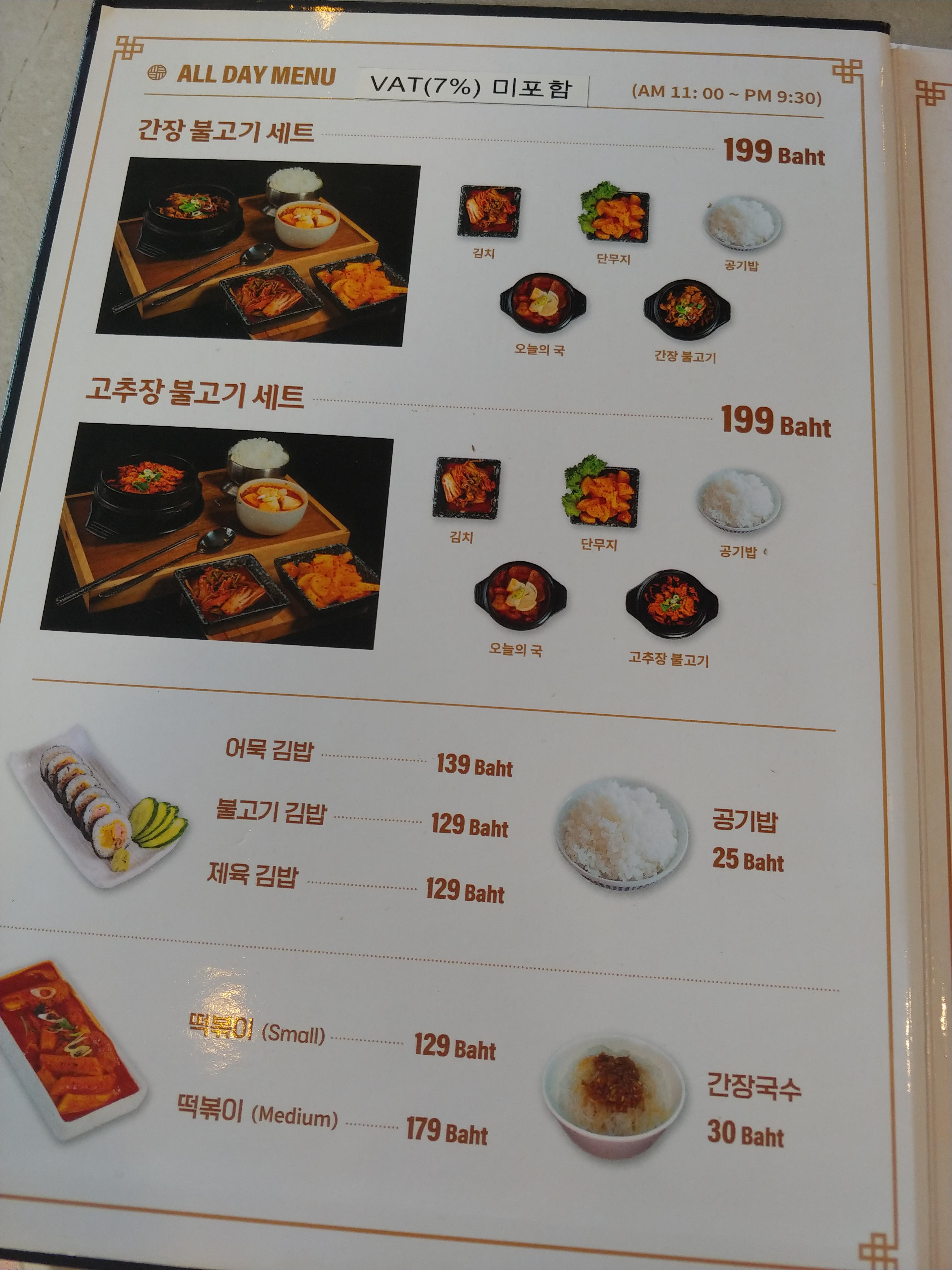 음식이 나오기까지 시간이 조금 걸렸다. 주문하고 십오분 뒤 고추장불고기가 나왔다. 한입 딱 먹는데 불향이 입안에 쫙 퍼졌다. 한국의 맛을 그대로 재현한게 놀라웠다. 국은 미역국이 나왔다. 그날그날 국의 종류는 달라진다고 한다. 조미료맛 나지 않고 깔끔하였다. 밥은 더 찰지고 질었으면 좋겠다고 생각하였다. 밑반찬이 김치, 콩나물, 시금치, 쌈장이 나왔는데 김치에서는 태국 젓갈 맛이 살짝 났고 쌈장은 색이 특이하였지만 맛은 괜찮았다.